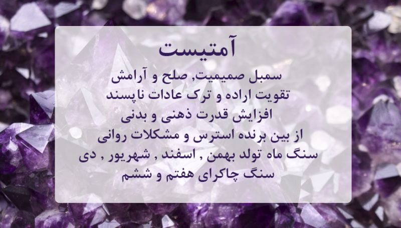 1 – آمتيست : آمتيست يک نوع کريستال هست که به عنوان سنگي براي ترک عادات ناپسند شناخته شده هست .همچنين گفته شده هست که اين کريستال براي افزايش ارتباط با بعد روحاني بسيار موثر ميباشد . کريستال آمتيست براي افراد متولد برج هاي اسفند – شهريور -بهمن – دي مناسب ميباشد .