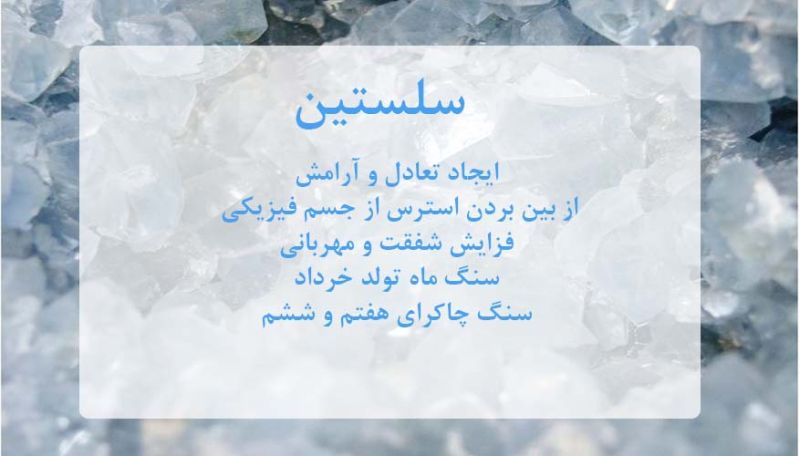 سنگ سلستين براي ايجاد آرامش و تعادل مناسب ميباشد .افرادي که از اين سنگ استفاده کرده اند ميگويند که اين سنگ کمک کرده تا رويا هايشان را به خاطر بياورند . سلستين همچنين به افزايش ايجاد ارامش و پاکسازي بدن کمک ميکند سنگ سلستين براي متولدين ماه خرداد مناسب ميباشد