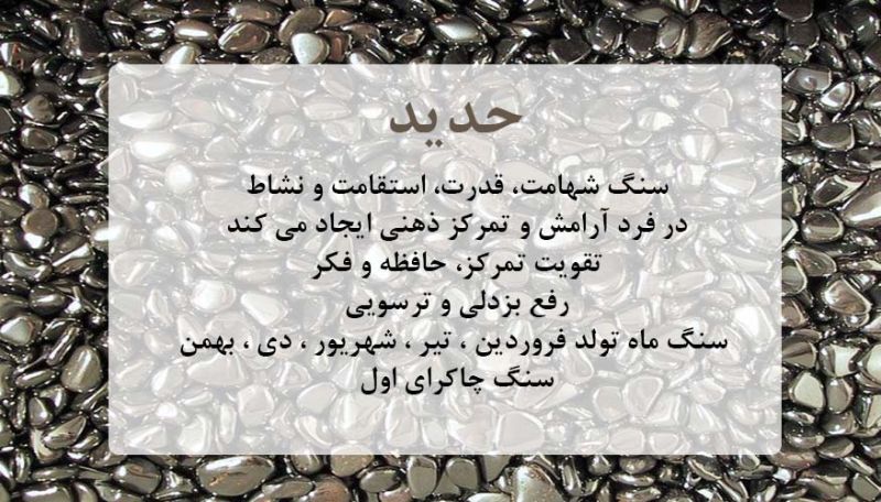 5- حديد : سنگ حدید براي ايجاد تعادل در زندگي استفاده ميشود . اين سنگ بهترين گزيته براي کساني هست که در فشار هاي عصبي و استرس قرار دارند همچنين اين سنگ باعث دور شدن انرژي های منفي و عصابنيت ميشود . بهترين گزينه براي متولدين ماه هاي فروردین , تیر , شهریور , دی و بهمن هست