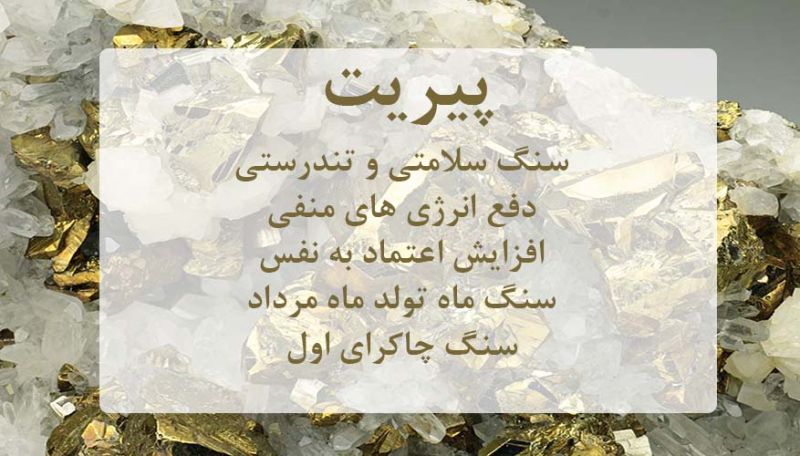 3- سنگ پيريت : سنگ پيريت براي محافظت از انرژي ها منفي و خطر هاي فيزيکي که احتمال روبرو شدن با آنها را دارید استفاده ميشود همچنين براي فعال کردن هوش و افزايش حافظه مفيد ميباشد. سنگ پيريت سنگ متولدين ماه مرداد ميباشد .