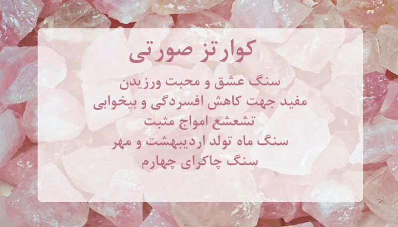 رزکوارتز يا کوارتز صورتي به سنگ عشق معروف هست .اين سنگ معمولا براي جذب افراد و عشق ورزيدن مورد استفاده قرار ميگيرد و بهترين گزينه براي محافظت از رابطه هاي عاشقانه ميباشد .همچنين سنگ رز کوارتز براي محافظت قلب از نا اميدي ها و رنج و ناراحتي ميباشد .