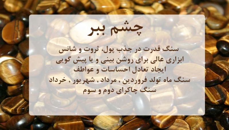 4- چشم ببر : سنگ چشم ببر براي افزايش ثروت استفاده ميشود . همچنين سنگ چشم ببر براي افزايش آگاهي و درک شهودي نيز مورد استفاده قرار ميگيرد .و براي کاهش استرس و ايجاد آرامش مناسب هست . سنگ ماه تولد فروردین , شهریور , خرداد و مرداد ميباشد .