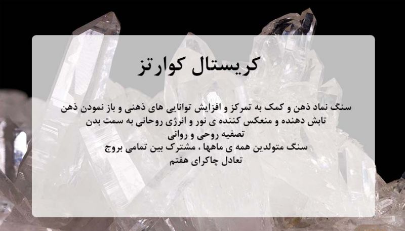کريستال کوارتز سنگي قدرتمند و پاک و منبعي از انرژي ميباشد . اين سنگ باعث ميشود که اگاهي شما افزايش پيدا کند . اگر احساس خستگي ذهني و جسمي ميکنيد استفاده از اين سنگ به شما پيشنهاد ميشود .کرستال کوارتز براي متولدین همه ماه ها مناسب هست